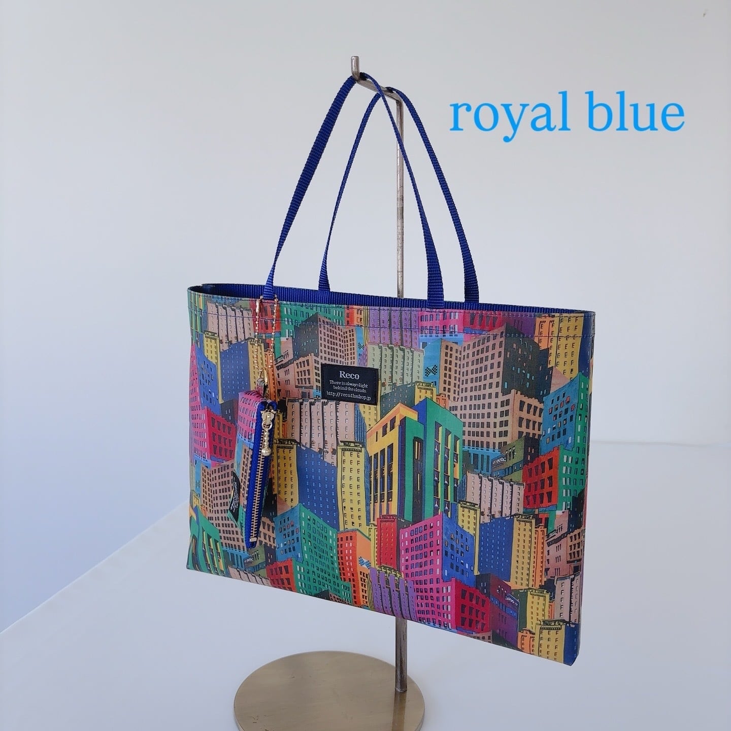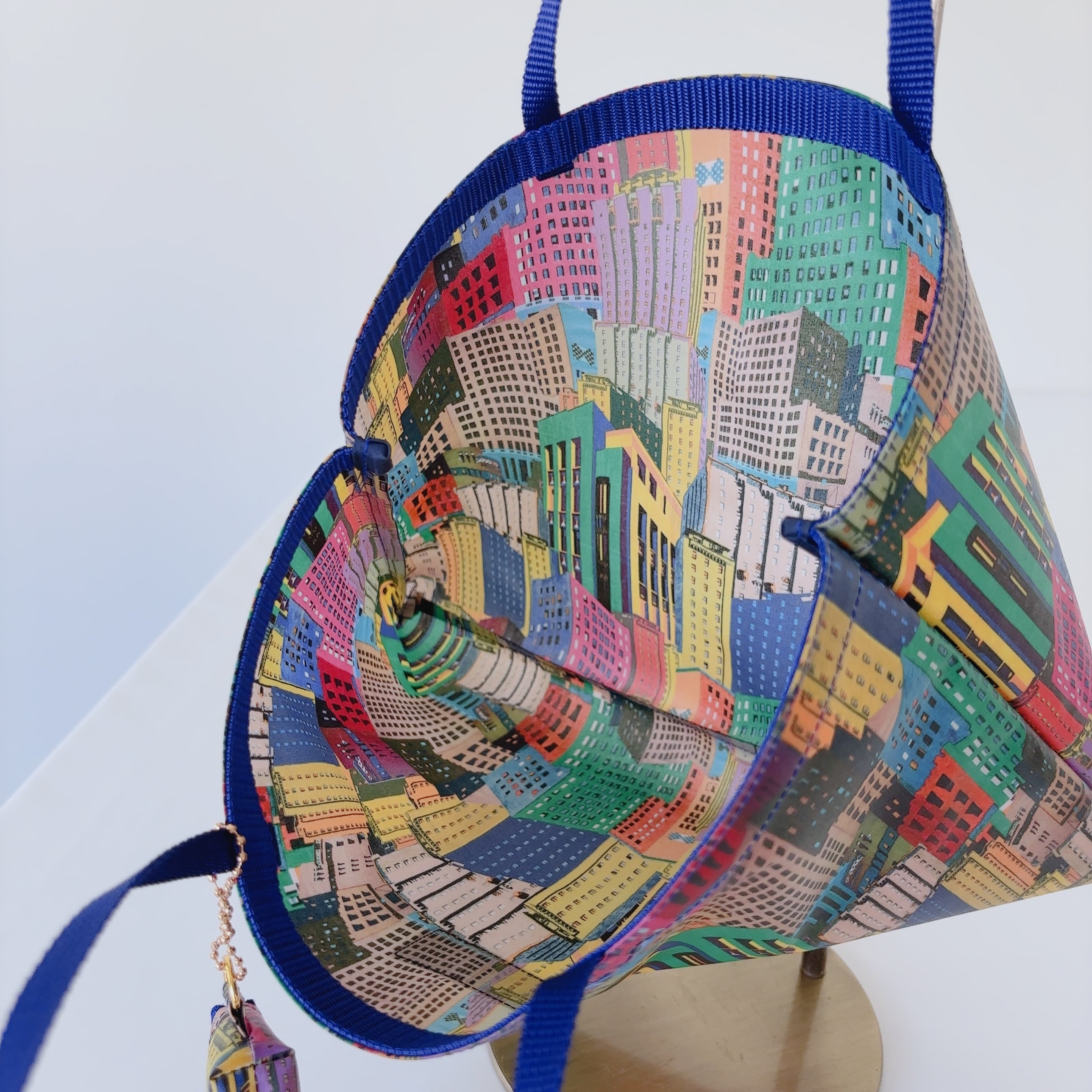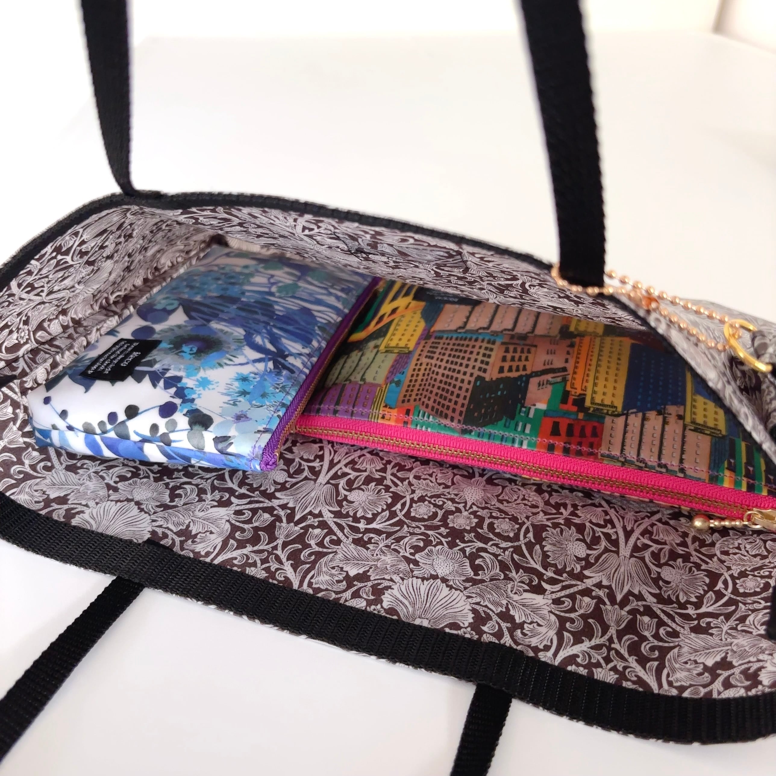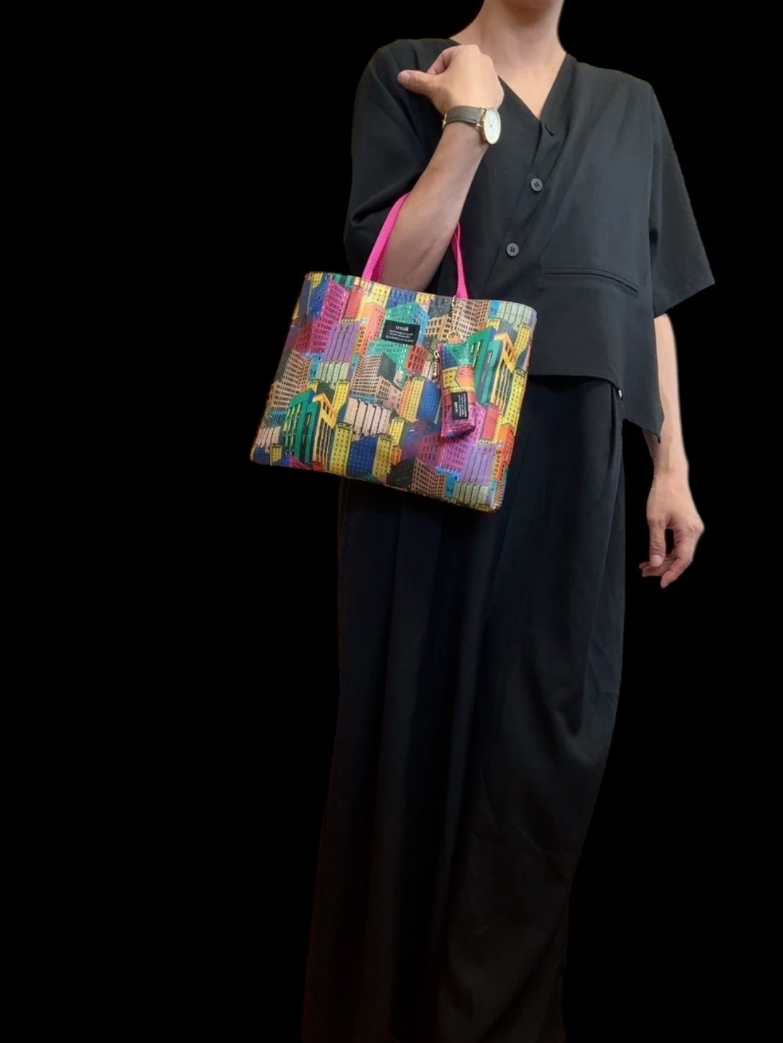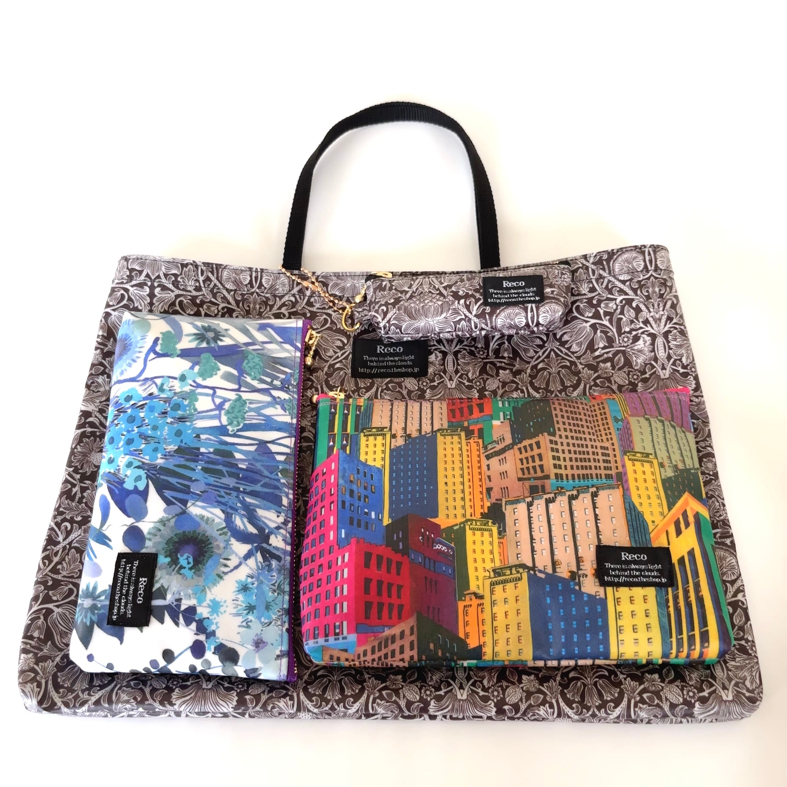 リバティプリントのラミネート生地を贅沢に使用し、一枚仕立てで仕上げた軽やかなフラットトートです。