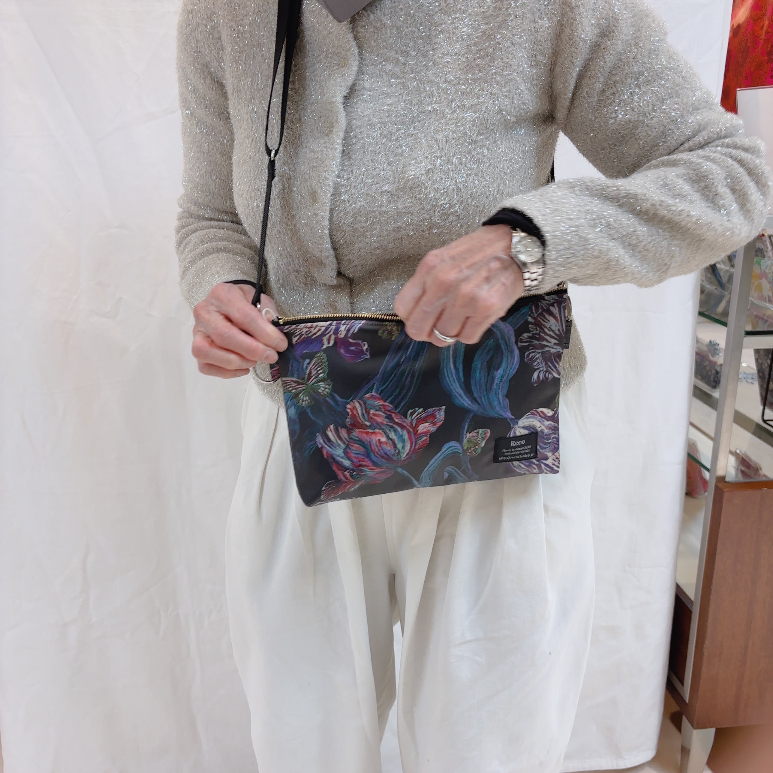 雨の日は、もちろん、汚れても、さっと拭き取れ、全面アルコール除菌もしていただける実用的で扱いやすいリバティプリントのラミネート生地でお作りした、ショルダーバッグです