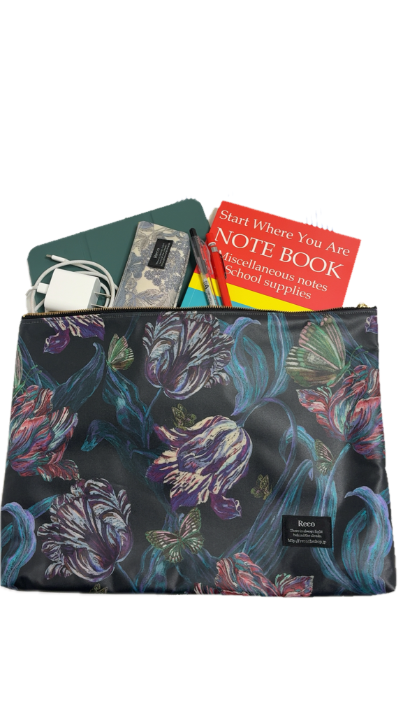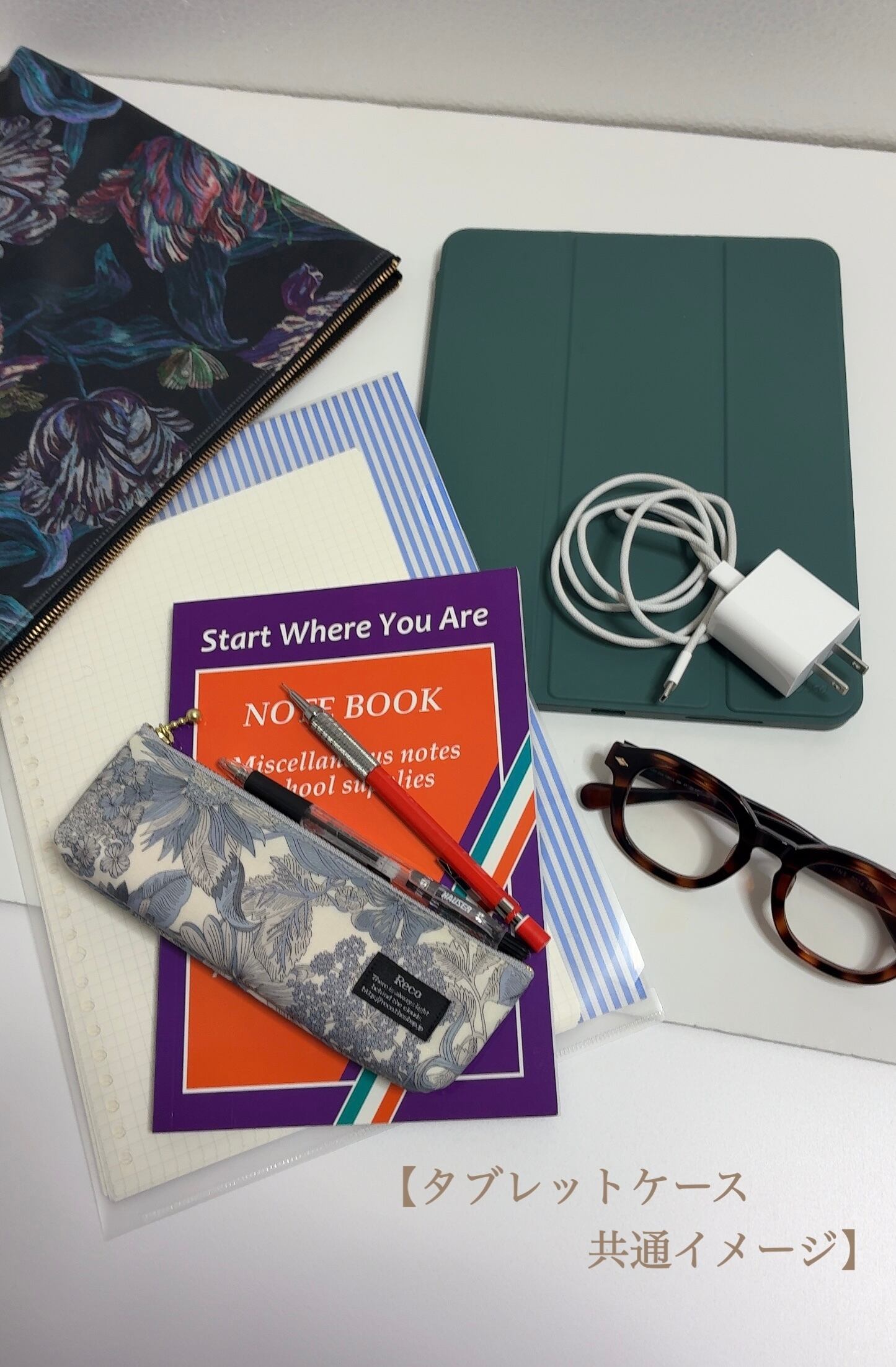 内側には大きなポケットと、細かいものを整理しやすい仕切りポケットがあって、タブレット本体やコード類、ノートやメモまでひとまとめにできます。